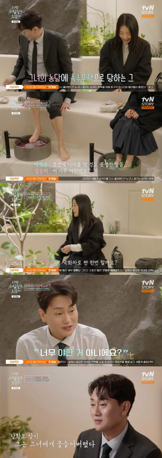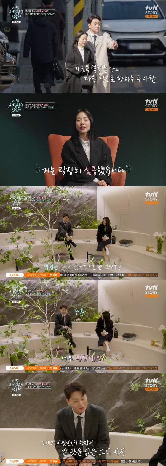 7일 방송된 tvN STORY '이젠 사랑할 수 있을까'에서 박형준과 김승미의 색다른 첫 만남이 그려졌다. 세 번째 맞선을 앞두고 박형준은 긴장감을 털어놓으며, "새벽에 깨서 잠을 한숨도 못 자고 나왔다. 무슨 얘기를 해야 할지 고민하다 보니 잠이 안 왔다"고 말했다. 첫 만남은 예상치 못한 방식으로 시작되었고, 박형준이 레스토랑에서 맞선녀를 기다리던 중, 직원이 물을 가져다주면서 "여기 앉아도 되나요?"라고 묻자 당황했다. 알고 보니 그 직원이 바로 맞선녀 김승미였던 것이다.