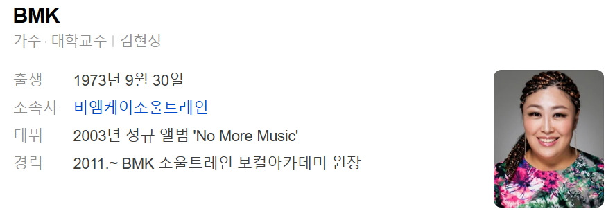 가수 BMK(김현정)는 1973년 9월 30일생으로 현재 51세이다. 본명은 김현정이며, 예명 BMK는 'Big Mama King'의 줄임말로 BMK 자신의 강력한 소울 보컬 스타일을 나타낸다. BMK의 고향은 강원특별자치도 속초시이며, 종교는 개신교를 믿고 있다. BMK의 학력은 속초여자고등학교를 졸업한 후 서일전문대학 유아교육과를 수료했다.