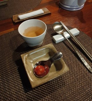 삼정 대표메뉴는 역시 우마카세 코스죠. 전채로 매실에 절인 토마토와 담백한 물김치, 잣가루 육사시미가 나오며, 이어 육회, 안심, 등심, 차돌박이까지 다양한 부위를 코스로 즐길 수 있어요.