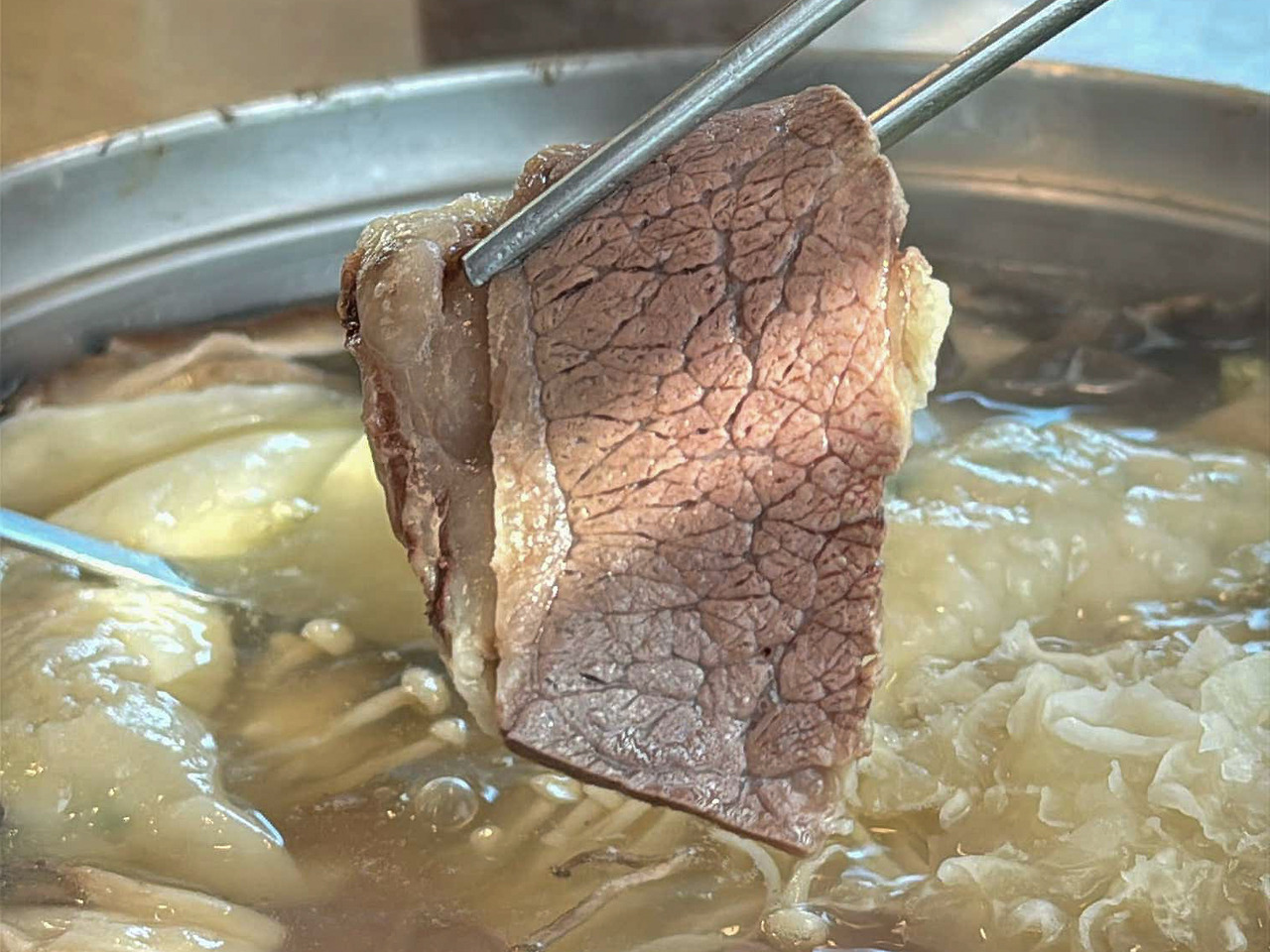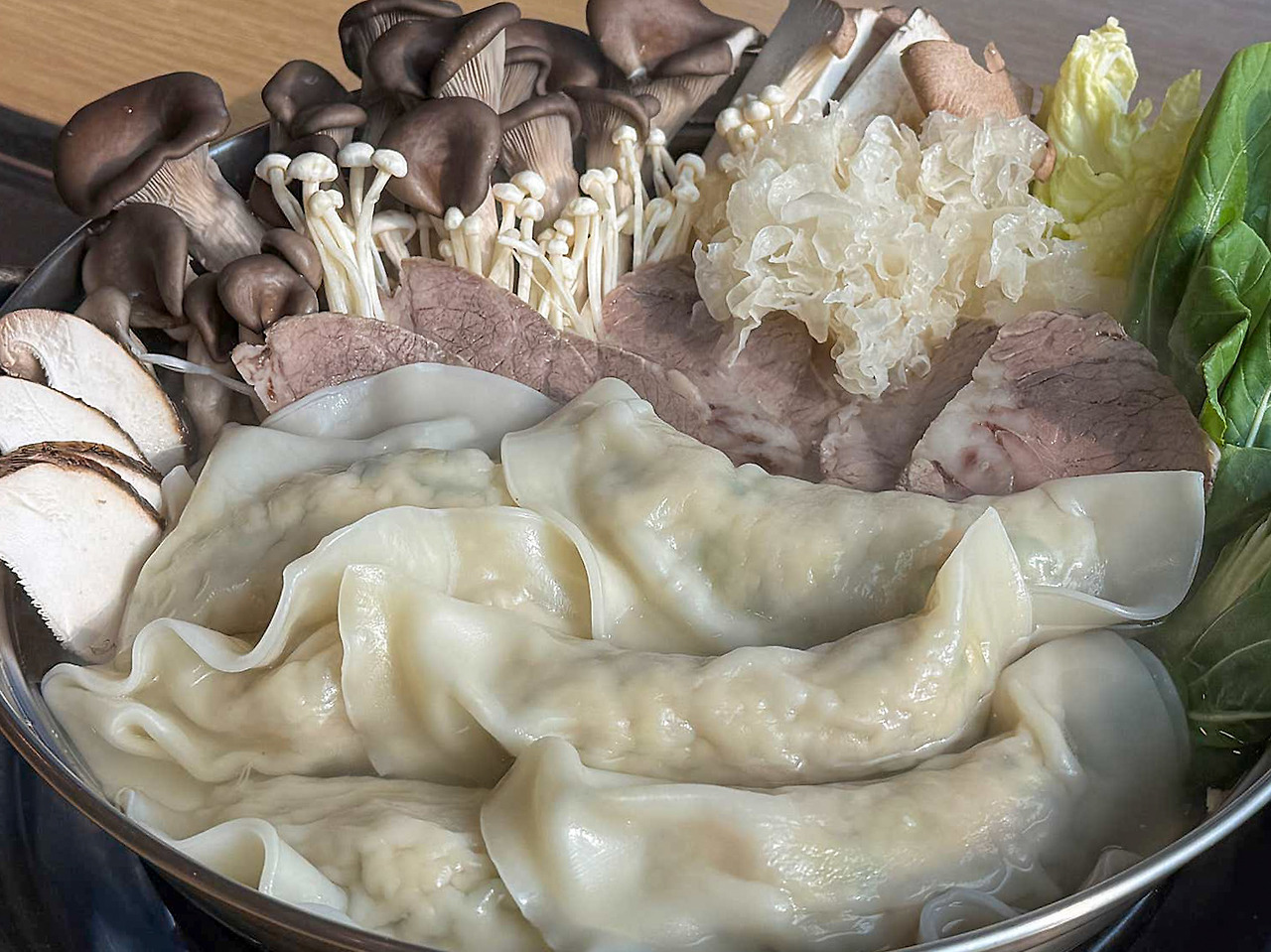 평양만두 파주헤이리점의 만두전골은 첫 국물 한 숟갈에서부터 “아, 이게 평양식이구나”라는 생각이 들었어요. 국물은 맑고 담백하지만 소양지를 오래 우려낸 깊이가 느껴져 속이 편안합니다. 큼직한 평양만두는 피가 얇고 속이 꽉 차 있어 한 개만 먹어도 든든하고, 채소와 고기 비율이 좋아 느끼함이 전혀 없어요.