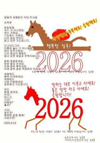 - 2026년 병오년, 새해 복 많이 받으시고 건강과 평안이 함께하시길 바랍니다.