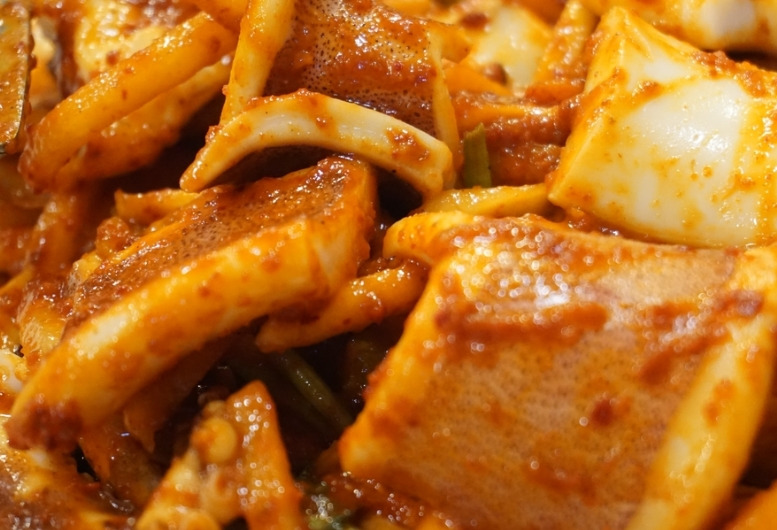 1986년부터 영업을 이어온 노포로, 최근 자리를 옮겨 2층 매장에서 운영 중이라고 하네요. 대표 메뉴인 오징어보쌈은 두툼한 오징어와 아삭한 무채를 매콤한 고춧가루 양념에 버무려 강한 불맛으로 완성한 요리입니다. 첫맛은 칼칼하고, 뒤로 갈수록 감칠맛이 올라오는 스타일이라 젓가락이 멈추질 않더라고요. 상추나 김에 싸 먹으면 매운맛이 한층 부드러워집니다.