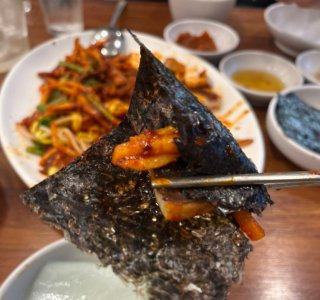 개인적으로는 김에 오징어와 무채, 콩나물을 올려 싸 먹는 조합이 가장 좋았습니다. 매운맛이 한결 정리되면서 풍미가 살아납니다. 그리고 마지막은 역시 비빔밥입니다. 남은 양념에 밥을 비벼 먹으니 이 집의 진짜 매력이 완성되는 느낌이었습니다.