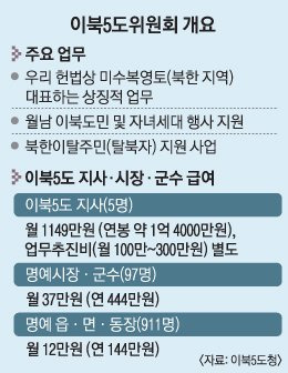 이북5도 도지사는 차관급 정무직 공무원이다. 보수는 차관급 보수 체계를 따르며 연간 약 1억4500만~1억5000만원 수준으로 알려졌다. 관용차와 기사, 연간 약 1500만원 안팎의 업무추진비도 지원된다.