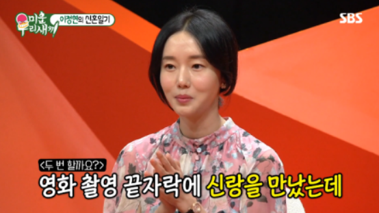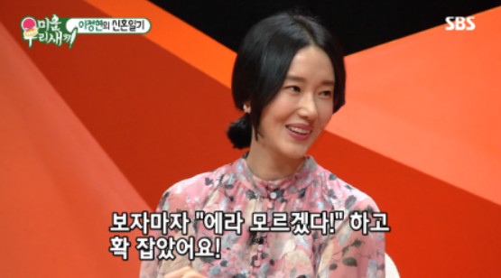 한 방송에서는 남편을 배우 친구들에게 처음 소개했던 날의 일화를 털어놓았다. 당시 공효진, 손예진, 엄지원, 오윤아, 이민정 등 가까운 배우들이 모인 자리였고 예비 신랑을 보고 싶다는 요청이 이어졌다. 급하게 남편을 부른 뒤 친구들과 함께 만나는 자리가 만들어졌다.