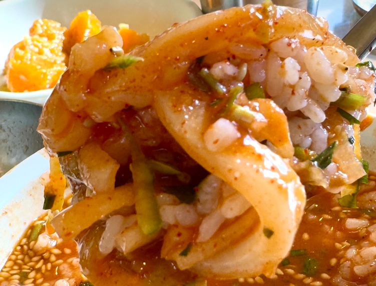 물회도 상당히 인상적인 메뉴였는데요. 커다란 그릇에 넉넉하게 담겨 나와 여러 명이 함께 먹기 좋고 육수는 새콤달콤하면서도 시원한 맛이 강해 입맛을 확 살려줍니다. 한치의 쫄깃한 식감도 신선도가 좋다는 느낌이 확실히 들었습니다.