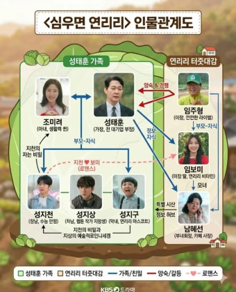 ‘심우면 연리리’는 도시에서 안정된 삶을 살던 대기업 부장 성태훈이 갑작스러운 발령으로 시골 마을 ‘연리리’에 내려오면서 시작된다. 예상치 못한 귀농 생활에 가족 모두가 휘말리며 갈등이 폭발하고, 기존의 가치관이 무너지는 과정이 현실적으로 그려진다. 농사 경험이 전혀 없는 상태에서 시작된 생존형 농촌 생활은 웃음을 유발하면서도 인생의 방향을 되묻게 만든다.