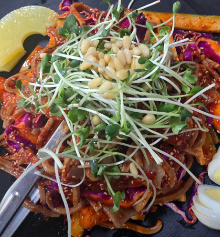 도토리전은 기대 이상으로 만족도가 높은 메뉴다. 겉은 바삭하게 구워져 있고 속은 촉촉하면서도 쫀득한 식감이 살아 있다. 기름기가 과하지 않아 국수와 함께 먹기에도 부담이 없고, 오히려 고소함이 더해져 식사가 훨씬 풍성해진다. 여기에 새싹무침까지 곁들이면 상큼함이 더해져 전체적인 균형이 잘 맞는다.
