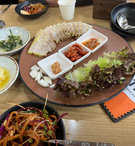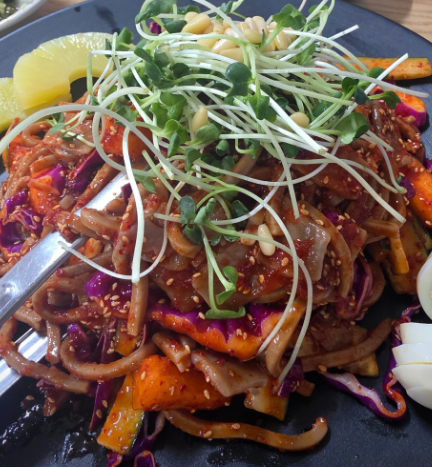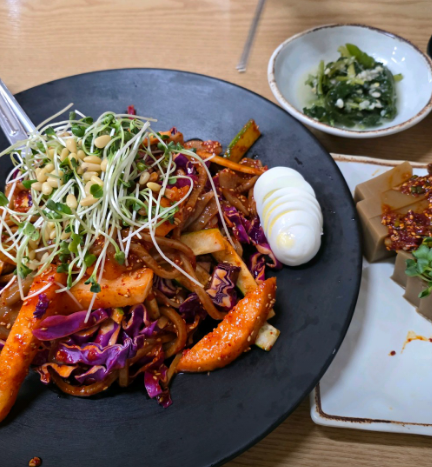 도토리 쟁반국수는 첫 입부터 상큼한 양념이 확 올라오면서 입맛을 깨워준다. 면 식감은 일반 국수보다 훨씬 쫀득한 편이라 씹는 재미가 있고, 채소가 듬뿍 들어가 있어 끝까지 질리지 않는다. 자극적이지 않은데도 계속 젓가락이 가는 스타일이다.