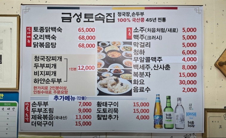 직접 띄운 콩으로 만드는 청국장은 특유의 강한 냄새는 줄이고 구수함은 살린 스타일이라 처음 접하는 사람도 부담 없이 즐길 수 있는 것이 특징이다. 여기에 큼직한 토종닭을 사용한 닭볶음탕까지 더해지면, 한 상이 완성되는 구조다. 자극적이지 않으면서도 깊은 맛을 내는 전통 방식이 그대로 살아 있어 방송 이후 더욱 주목받고 있는 용인 대표 한식 맛집이다.