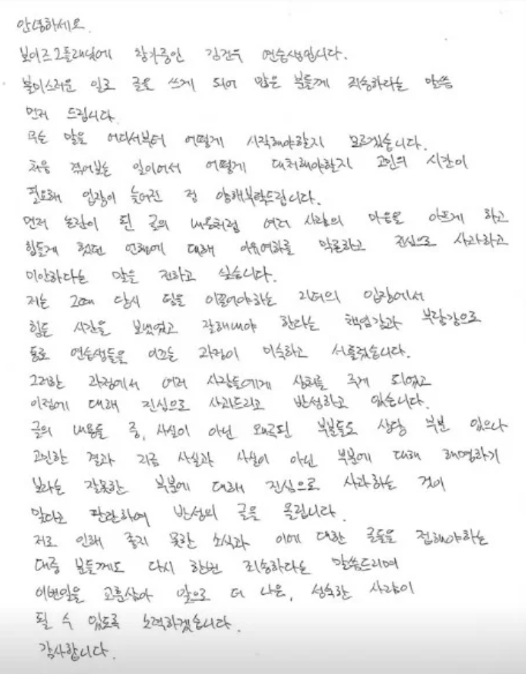 논란이 커지자 김건우는 자필 사과문을 통해 미숙한 리더십으로 상처를 준 점을 인정하고 고개를 숙였다. 다만 일부 주장에 대해서는 왜곡된 부분이 있다고 반박하며 억울함을 동시에 호소했다.