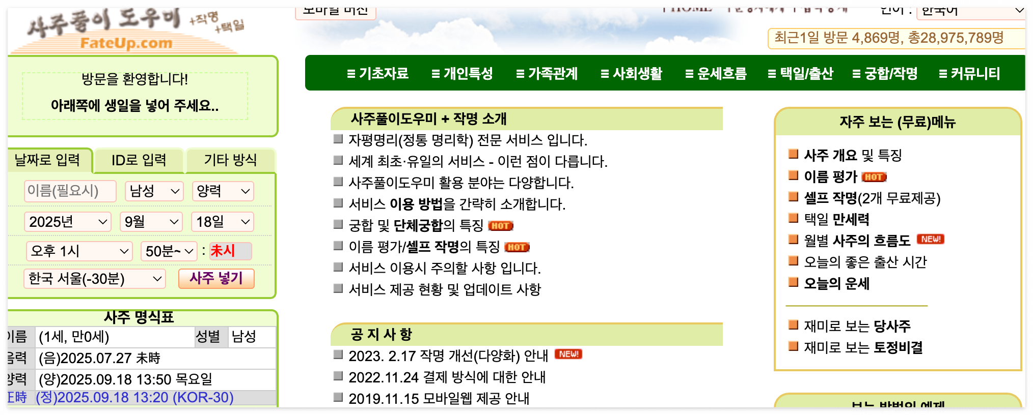 앞날의 길잡이 사주 풀이, 무료 만세력 및 사주팔자 명식, 인터넷 셀프작명 및 이름풀이, 작명법, 남녀궁합 및 단체궁합, 출산 택일, 무료 운세